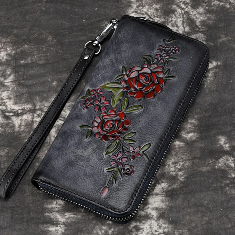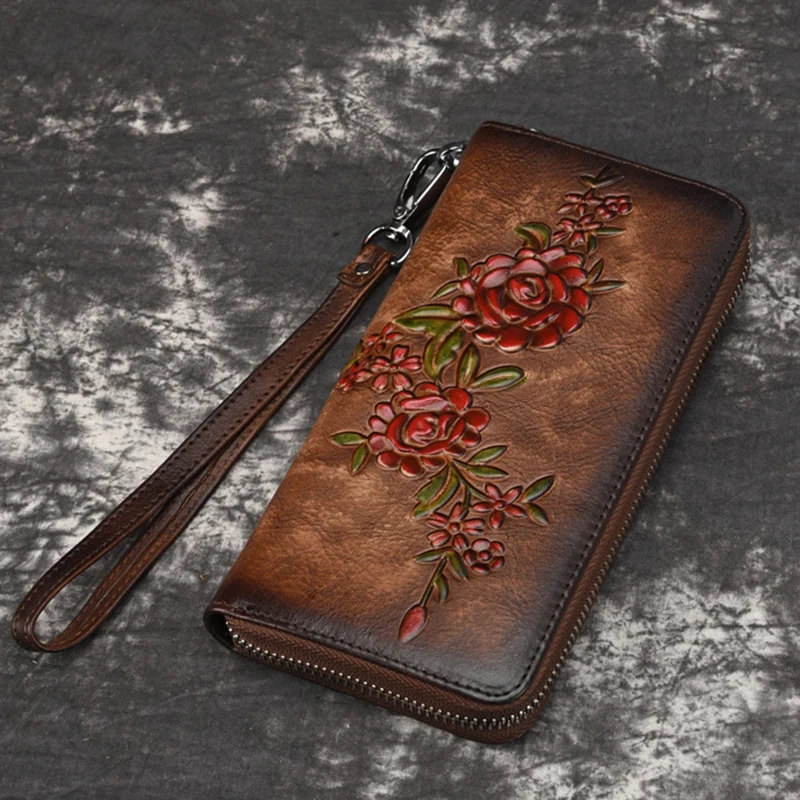 . [Скидка 39%] Купить Женский Длинный кошелек из натуральной кожи, сумочка для денег, держатель для ID карт, Тисненый Цветочный узор, натуральная кожа, на молнии, к... Цена Дешево.